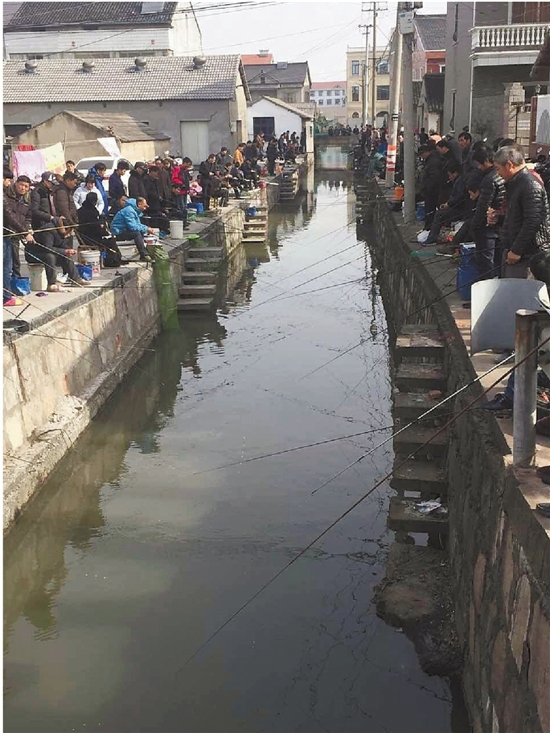 慈溪上蔡村一条小河畔,钓竿交织成网,几百人共垂钓