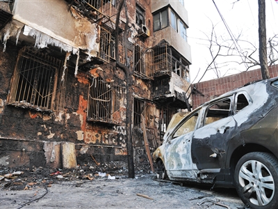 昨日,团结湖北二条一号楼外墙被熏黑,楼下还有一辆被烧毁的轿车。新京报记者 王嘉宁 摄