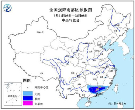 未来三天,强降雨还将持续。中央气象台今天继续发布暴雨蓝色预警。预计,21日08时至22日08时,广西东北部、广东中北部和珠三角地区、湖南西南部、江西南部、福建南部等地的部分地区有大到暴雨,其中,广东中北部等地的局部地区有大暴雨(100~120毫米);上述部分地区有短时强降水,最大小时雨强可达30~60毫米,局地并伴有雷暴大风或冰雹。