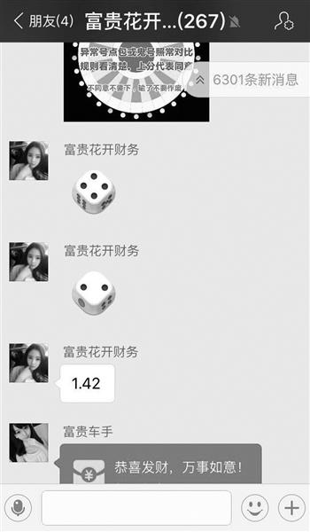 北青报记者在群名叫“8090龙虎斗”群押注数天发现,虽然按照规则,发包手根据骰子点数发红包,群里任何人均能参与抢红包。