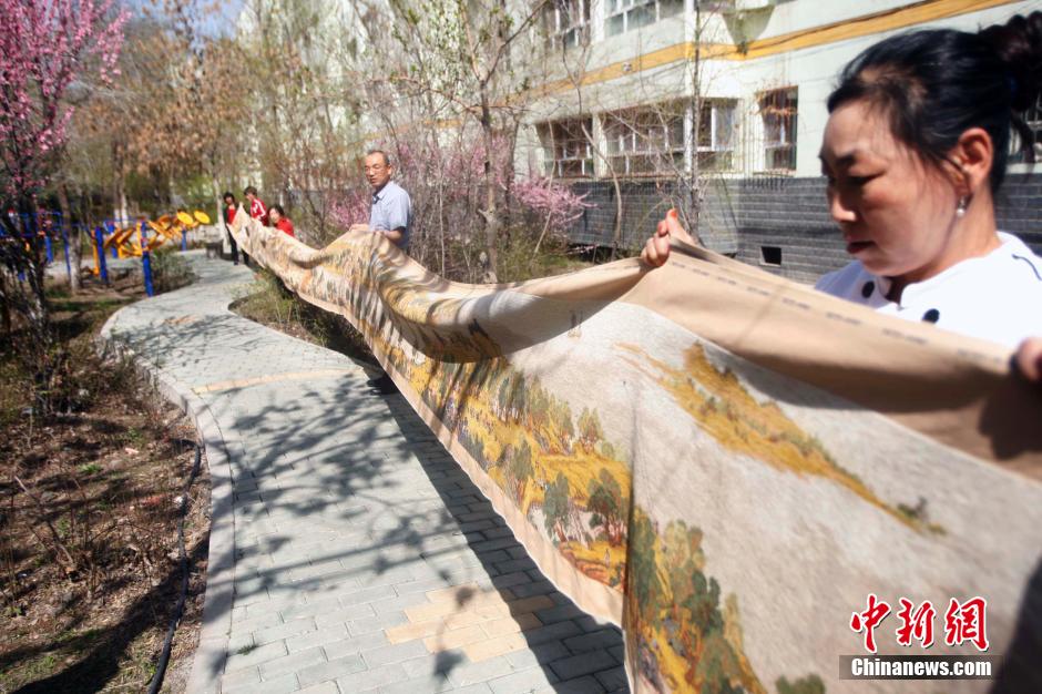 4月12日消息,新疆昌吉市民张静用了4年时间,用掉50多根针、12斤线、绣了1000余万针,终于完成了重达10公斤、长达22米宽70厘米的《清明上河图》十字绣。张静介绍,2012年初她花1万余元购买了材料,每天穿针引线,有时弄到凌晨两三点,直到2016年4月初,终于完工,之后一直珍藏在家里。据悉,整个《清明上河图》长卷中,绣的人物多达684个,牲畜96匹,舟船25艘,楼台亭阁122座,还有树木124棵,马车推车等25辆,桥9座,而整个长卷的颜色均匀,平整光洁,从远处看如同用笔绘成。 中新社记者 王小军 摄