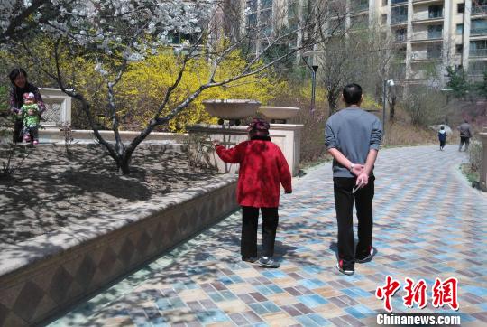 每个天朗气清的中午,这对高龄母子都会出门散步。图为散完步回家时,母亲宁桂兰正在和邻居打招呼。 佘丽莎 摄