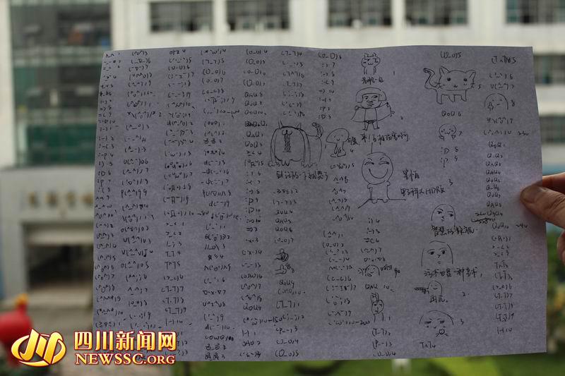 现场四川新闻网记者也看到了汪炜的表情符“检讨”。在超过半张纸的“颜文字”旁边,还画着表情包,并配上一些文字,趣味横生。颜文字几乎包含了各种表情:举手欢呼,眯眼微笑,也有泪流满面。另外半张纸的表情包中,有被注明“可爱”的小人儿,也有长着胡子的大脸猫;在一张囧囧有神的脸旁边,汪炜写下“智慧的凝视”。