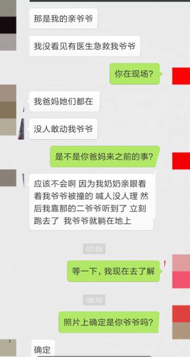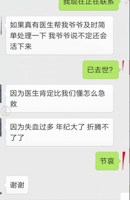 6月22日早上,一名自称是伤者孙女的女孩与网友聊天的信息公布于众,女孩称:她并没有看到有医生急救她爷爷,她爸妈都在现场,是没有敢动爷爷的。并称,如果真有医生帮及时简单处理一下,爷爷说不定会活下来。
