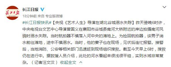 据长江日报官方微博报道,昨日(6月22日)傍晚6时许,中央电视台文艺中心导演曾国义在襄阳市谷城县南河大桥附近的岸边拍摄南河风貌时溺水失踪。当时航拍器不慎落入河中央的滩地上。为捡回航拍器,该男子淌水前往滩地,途中不慎溺水。当时,他的妻子也在现场,见状后连忙报警。接警后,当地消防、公安等相关部门迅速赶到现场组织搜救。截至今天早上6时,搜救仍在进行中。据救援人员介绍,此处的河水看起来很浅很平坦,实则水域非常复杂。