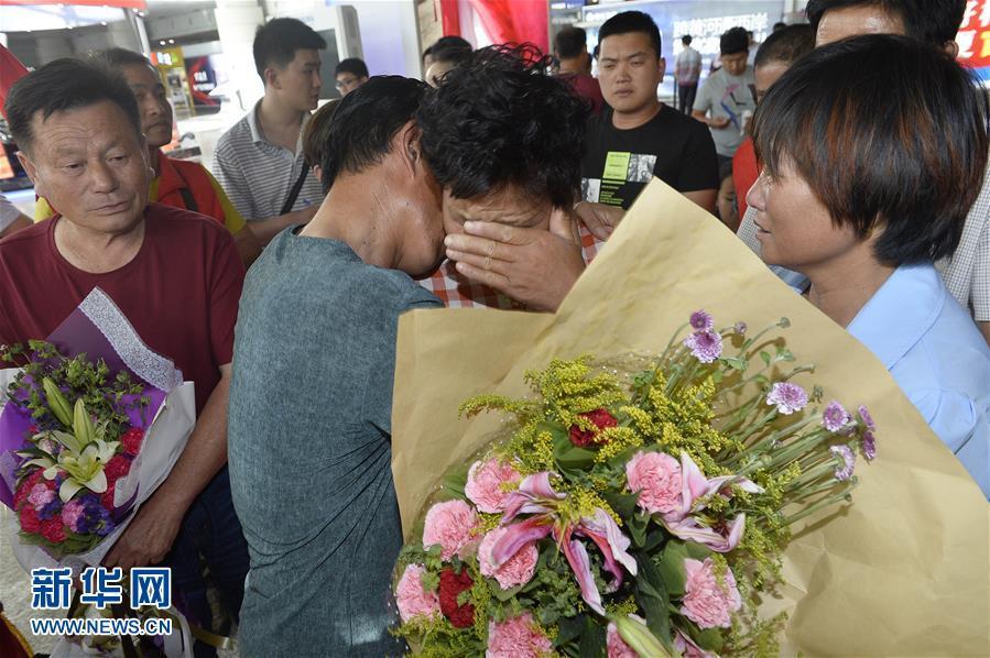 6月28日,刘美艳(右二)在宁夏银川河东机场和弟弟妹妹们拥抱在一起。今年50岁的刘美艳是宁夏吴忠市盐池县麻黄山乡高窑村人。1980年秋天,刘美艳在村口被人拐走,后几经辗转,她被拐至安徽省宿州市萧县阎集镇李各村,并一直在此生活。多年来,她的家人一直四处寻访她的下落。经过“宝贝回家”志愿者协会志愿者的努力,刘美艳和自己的家人取得了联系。6月28日,刘美艳在志愿者的陪伴下,回到了离别36年的老家宁夏,和亲人团聚。新华社记者 彭昭之 摄 图片来源:新华网