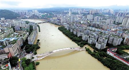 昨日,綦江城区彩虹桥因綦河水位猛涨部分被淹。 首席记者 钟志兵摄