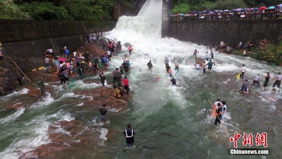 6月29日,位于浙江省衢州市衢江区杜泽镇的铜山源水库泄洪,大批市民涌入泄洪口,冒险捕捞水库冲出来的鱼儿。 (来自:中新网)