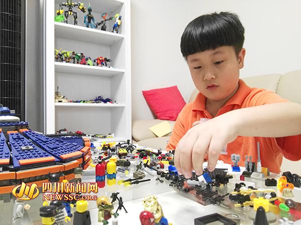 6月30日下午,杨一郎坐在客厅的板凳上,一边看着电视里的美国大片,一边忙着拼装乐高玩具。在客厅的小桌子上,放满了这些玩具。电视机前的一长串玩具,已经是他拼装好的。每一个拼装好的玩具,他都会放在这里。初步数了一数,大概有三四十个。