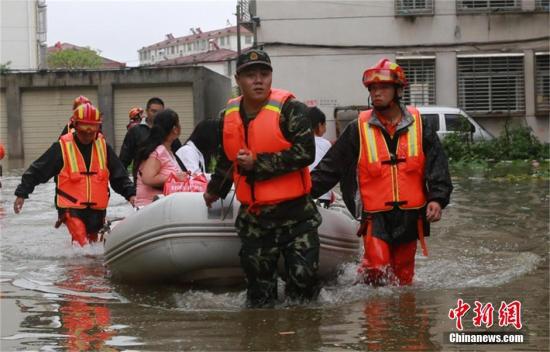 7月6日,湖北省汉川市城隍镇一小区被淹,大量人员被困。由于积水已漫过楼道,橡皮艇无法靠近,为避免被困人员落水,消防官兵拱起大腿,架起“桥梁”,帮助被困人员转移。在浅水区,消防官兵抱起孩子,背起老人、妇女,将其转移到安全地带。经过3个多小时的营救,消防官兵往返多次,成功转移45名被困人员。王基达 摄