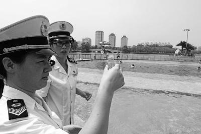7月6日,北京市卫生监督所检查人员来到朝阳区朝阳公园检查露天游泳池水质。