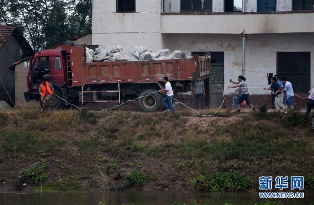7月10日,身系安全绳的抢险人员(左一)在载满麻石的卡车坠入溃口前,跳出驾驶室。当日上午,湖南省华容县新华垸发生重大管涌险情,10时57分出现溃口。在抢险救援中,出现了一种惊心动魄的方式:身系安全绳的抢险人员驾驶着载满麻石的卡车驶向溃口,在卡车坠入溃口前跳下卡车,用连车带石的方式堵溃口。目前抢险救援工作仍在进行中。新华社记者 李尕 摄