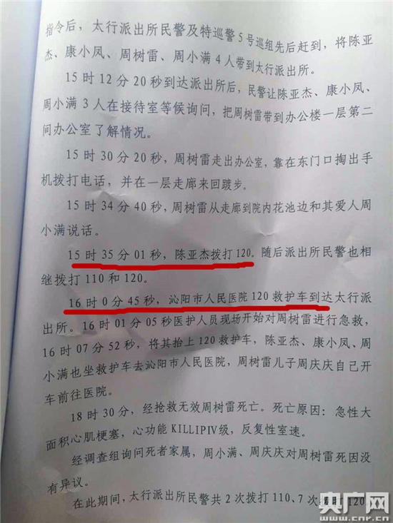 陈亚杰这样描述当时的经过:他说不舒服的时候我就马上打的120,我说太行派出所有人晕倒了,(120)他说哦,马上到!我记得很清楚,对方是 个男的。打过120之后急救车已经过来了,但是没进院里,我听见声音了,到了之后又走了。我妈说了一句怎么来了又走了,我赶紧15点37分又给120打了 一次。我说赶紧过来呗,那边说已经派车过去了。