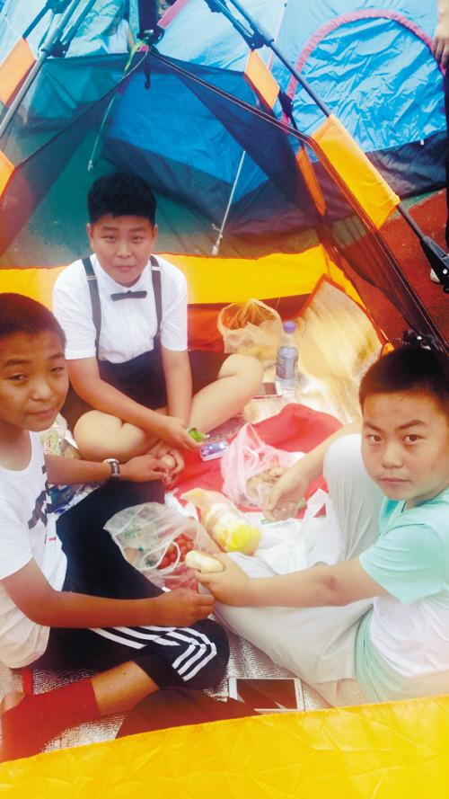 7月23日18时,记者在现场看到,在简短的毕业典礼结束后,毕业露营活动拉开了序幕。近100顶帐篷在操场上搭就,三三两两的孩子自由组合进入帐篷,分享他们自己准备的美餐。
