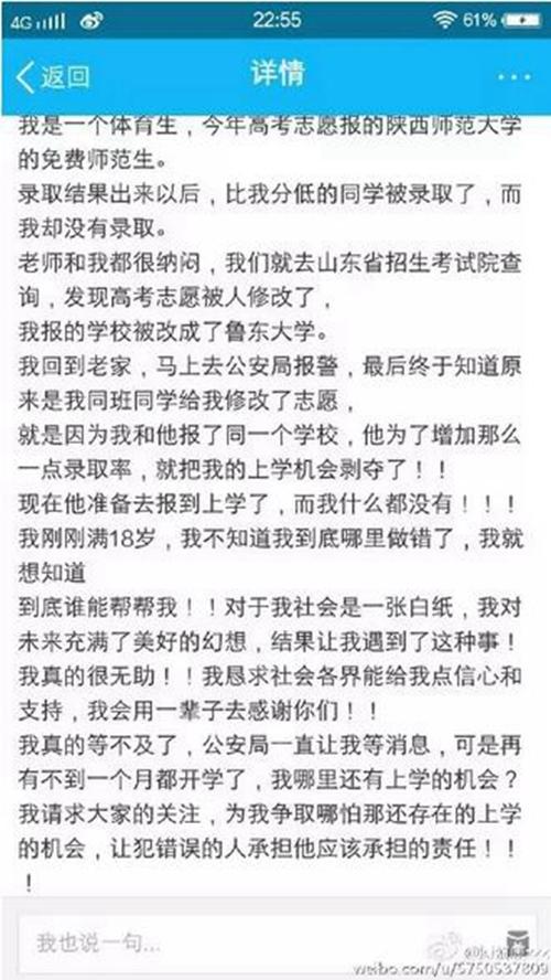然后7月23日这天,这报考的这一批次的征集志愿下来了,这时候,他才惊讶的发现,征集志愿中,竟然有一个陕西师范大学免费师范生的名额。他的同学比他分数低,都被陕西师范大学录取了,而他的分数还要高一些,竟然没被录取,而且,根本就没有招满。学校没招满,还不录取分数足够的他,这是为什么?于是,他这才想起来去查阅自己的报考记录,结果让他大吃一惊。他根本就没有报陕西师范大学,他的记录,被改成了鲁东大学的体育休闲教育专业。