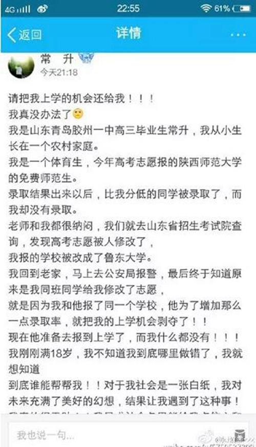 8月1日深夜,多位青岛胶州的朋友向半岛记者爆料,青岛胶州一中一位叫做常升的高三考生,今年报考陕西师范大学的免费师范生,但志愿竟然被人偷偷篡改,结果导致自己上不了大学!这位考生怀疑是自己的同班同学偷改了他的志愿,这位同学报考了和他一样的大学,分数比他还要低,结果这位同学被陕西师范大学录取,而自己等来等去,没有录取结果,上网一查,才发现自己的志愿已经被改了!