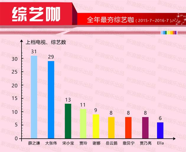 当我们讨论一个艺人究竟算不算综艺圈儿里的大红人时,先看看到底有多少档节目愿意请他去做嘉宾吧!这是最简单直观的。在此,我们以“年”为单位(去年7月左右-今年7月),把一年内上档(或已录完,即将上档)的电视、网络综艺进行了一番梳理,以下几位便是获邀参与综艺节目数量最多的红人儿。