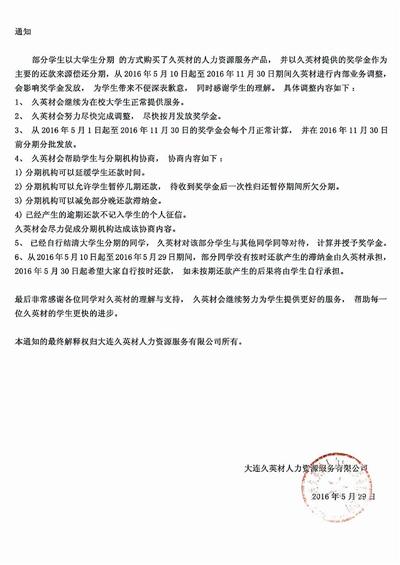 经过多番协商,当晚久英材给出了一份书面通知。这份盖有久英材公章的通知显示,久英材承认学生“以大学生分期的方式购买了久英材的服务产品,并以久英材提供的奖学金作为主要的还款来源偿还分期”。久英材表示,11月30日之前,由于公司进行内部业务调整,导致奖学金无法正常发放。久英材承诺,在此期间会和分期机构协商,允许学生暂停几期还款。
