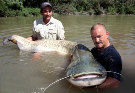 生性凶残和贪婪的六须鲶鱼(又称欧洲巨鲶)身长无鳞,宽扁的鱼头上有一张惊人的阔嘴,里面长满一排排砂纸般的细牙,足有几百颗。它们的上下颌上各长着一套触须(象腮须一样的器官),帮助它们在混沌的水域中捕捉猎物,因此它们的身影遍布欧洲的大湖以及水流不急的河流。六须鲶鱼是老练的捕猎者,捕猎时先划动胸鳍,制造出漩涡让猎物失去方向,然后张开那张巨大无比的阔嘴,象吸尘器一样把猎物吸进嘴里,囫囵吞下。