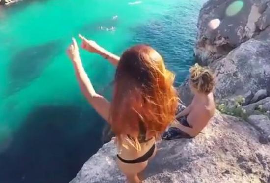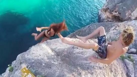 视频中,这对身份不明的情侣坐在悬崖上俯瞰美丽的泄湖水域。穿着比基尼的年轻女子准备跳入水中却不慎绊倒,惊慌失措地抓住了岩壁。接着,她伸手欲抓住男友的腿爬上悬崖——然而男子却把腿移开,从容地目睹着女友滑落崖壁,跌入水中。
