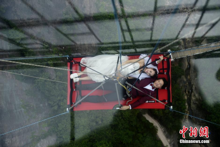 8月9日,正值“七夕”中国情人节。当日,一对“90后”夫妻在湖南平江石牛寨玻璃桥举行了一场特殊的高空极限婚礼,以此特殊方式纪念自己的新婚。图为“90后”夫妻在吊帐上“秀恩爱”。杨华峰 摄
