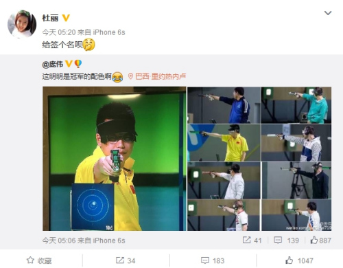 8月9日,庞伟晒出自己的奥运参赛照片,并配文:“这明明是冠军的配色啊”。而杜丽则回复道:“给个签名呗”。