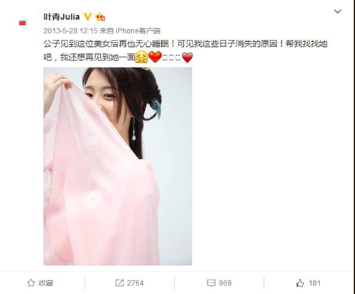 资料图:叶青晒古装扮相。(叶青微博截图)