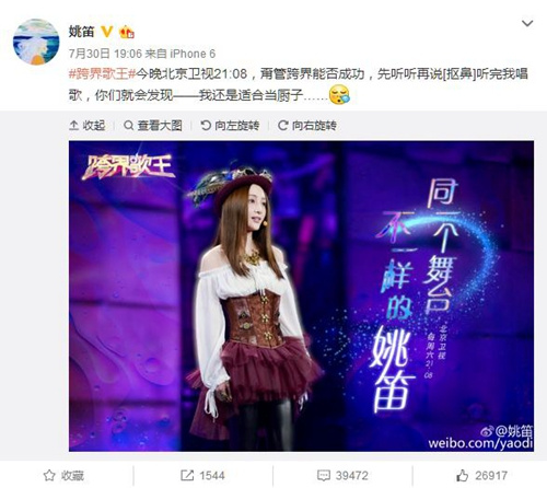 资料图:近日姚笛录制《跨界歌王》。(姚笛微博截图)