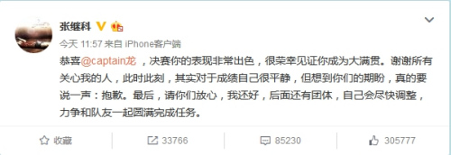 在决赛输给马龙没多久,北京时间12日中午,张继科在微博上首先恭喜马龙夺金,“决赛你的表现非常出色,很荣幸见证你成为大满贯。”然后表示,“对于成绩自己很平静,但想到你们的期盼,真的要说一声:抱歉。”最后,张继科让大家放心,他很好,正在为团体赛作调整,力争和队友一起圆满完成任务。