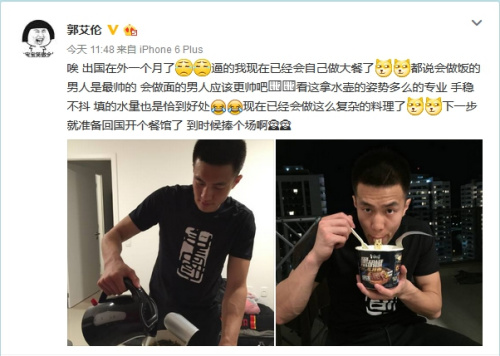 虽然男篮在本届奥运上未尝胜绩,但球员们的心态还算平稳。北京时间12日中午,郭艾伦在微博中晒出自己吃方便面的照片,“出国在外一个月,逼的我现在已经会自己做大餐了。”照片中,郭艾伦手持水壶正在泡面,“都说会做饭的男人是最帅的,会做面的男人应该更帅吧!看这拿水壶的姿势多么的专业手稳不抖,填的水量也是恰到好处。现在已经会做这么复杂的料理了,下一步就准备回国开个餐馆了,到时候捧个场啊!”