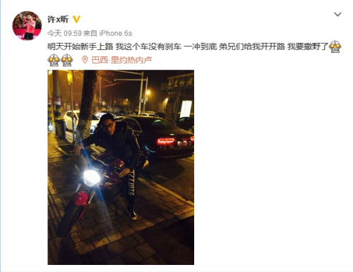 乒乓球团体的比赛即将开始,中国选手许昕已经迫不及待了。在微博晒出一张骑车的照片,宣告新手要上路了,“明天开始新手上路,我这个车没有刹车,一冲到底,弟兄们给我开开路,我要撒野了!”