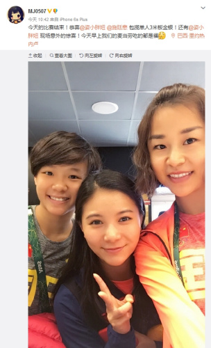 北京时间8月15日,国家羽毛球运动员马晋在微博晒出与何姿、施廷懋的合影,还留言恭喜何姿,施廷懋包揽单人3米板金银,称:“今天早上我们的麦当劳吃的都是福。”照片中,三人面对镜头开心微笑。