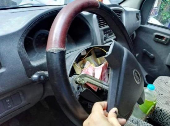 记者:偷来的钱不是都养家了,怎么还藏在方向盘盖里?