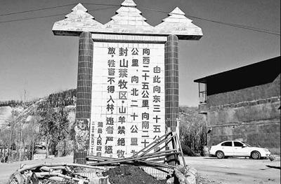 走临大公路到蒲县,路边能看到一处告示碑,白底红字,上面写着几行大字,“由此向东三十五公里,向西二十五公里,向南二十五公里,向北二十公里为封山禁牧区,山羊禁绝牧放,牲畜不得入林,违者严惩。”落款是“蒲县人民政府 二〇〇〇年九月二十八日”。