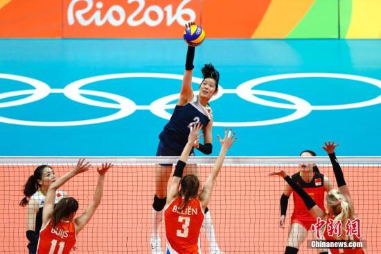 当地时间8月18日,2016里约奥运会女排半决赛,中国队对阵荷兰队,3:1淘汰对手。图为朱婷在比赛中。中新网记者 富田 摄