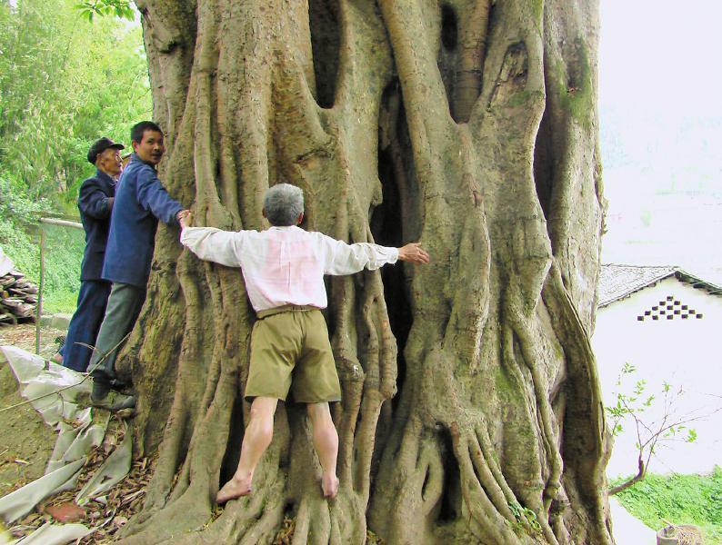 当地人担忧古树,也亲近古树,夏天没事,就约上几个人进入树干里面打牌玩。因为树干壳的局部枯朽,形成了大洞小孔,从树干里面往外看,这些孔洞好似开的门窗,人们可从树窗随意探出头或身子,所以树干中光线不错。树干约齐人胸高处,有一个较大的孔洞,算是人们进出的门。