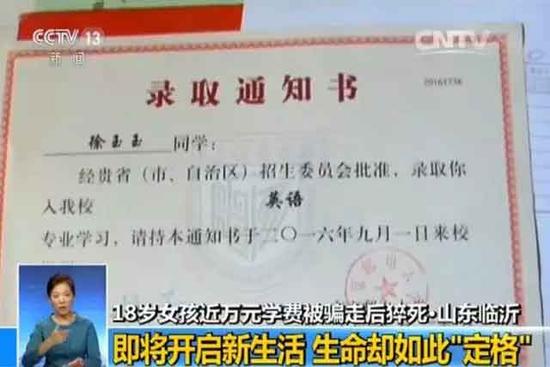 徐玉玉是今年的应届高考生,前不久,她收到了南京邮电大学英语专业的录取通知书,即将踏入大学校园,开始新的生活,但一切都被一个诈骗电话改变了。