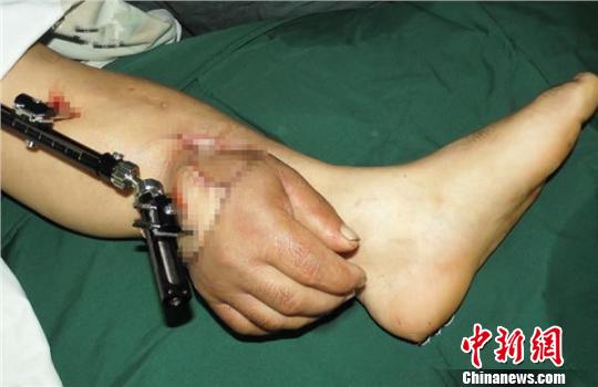高师傅的断手“寄养”在小腿上。 杨俊辉 摄