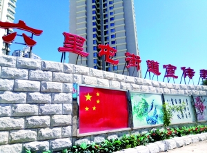 在姚家园路与甜水园街十字路口的东北角,记者昨日看到一堵墙上悬挂着“六里屯街道宣传教育园地”字样,张贴着几幅关于精神文明等内容的纸质宣传画。排头的是一幅五星红旗,国旗上四颗小星星平行排列(如图)。