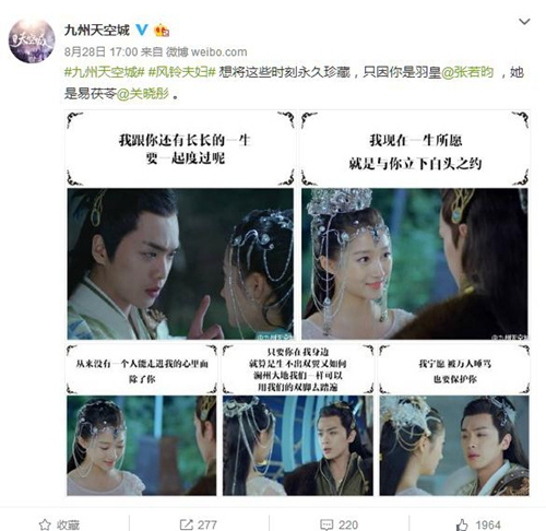 《九州天空城》则因剧中人物名称引发争议,有网友表示,“风天逸,易茯苓、雪飞霜听起来好像化妆品”、“这名字太文艺了吧”。同时,剧中“你若是能笑一笑,定叫做这满山的茶花都尽失了颜色”的台词也被网友吐槽“琼瑶风”太明显。