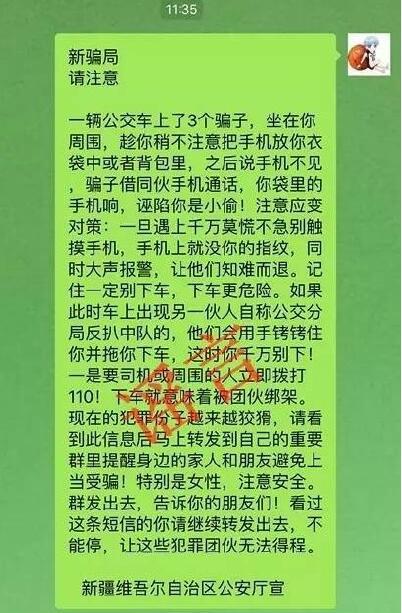 近期,微博、微信等社交平台流传着一个公交车上“高级骗局”的提醒,消息称“一辆公交车上了3个骗子,坐在你周围,趁你稍不注意把手机放你衣袋中或者背包里,之后说手机不见,骗子借同伙手机通话,你袋里的手机响,诬陷你是小偷!注意应变对策:一旦遇上千万莫慌不急别触摸手机,手机上就没你的指纹,同时大声报警,让他们知难而退。”这则名为新骗局的消息说得有板有眼,落款为“新疆维吾尔自治区公安厅宣”,尽管没有明确说明案发的时间、地点,但还是让部分网友误以为此类诈骗已在新疆发生,发布后被当地网民大量转发。