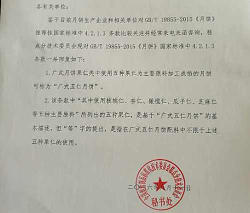 对此,全国焙烤制品标准化技术委员会糕点分技术委员会在函件中解释称,“等”字的提出,是指在广式五仁月饼配料中不限于上述五种果仁的使用。