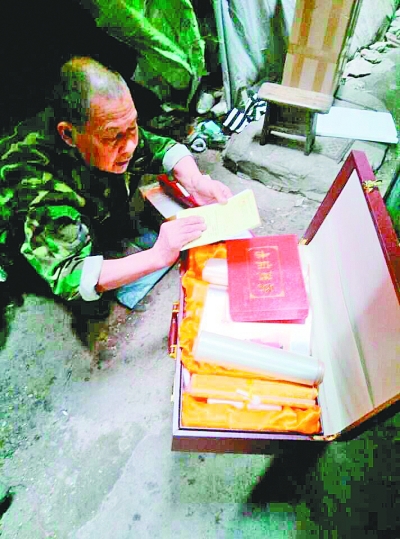 昨天,在硚口区古田一路东风村,武汉晚报记者在代爹爹家里看到了这堆快递物品。房里黑黢黢的,刚一进去眼睛几乎看不到任何东西。开灯后,灯光暗黄。小房间里堆满了衣服、碗筷和一些捡回的废品,两个光鲜的木盒子与环境格格不入。