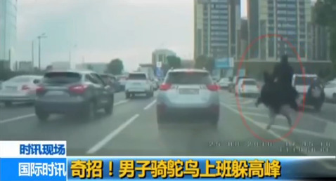 每每到了上下班巅峰时刻,司机们都得忍受十几分钟前进不了几百公尺的塞车时段,总是磨掉不少人的耐心。哈萨克斯坦日前出现了一幕让所有不耐烦的司机爆笑的 场面。通过视频可以看到,在几乎动弹不得的车阵中,行车记录仪车主的右手边突然冲出了一名骑着鸵鸟的男子,就这样高速穿梭在车阵中,让所有司机当场看傻眼。行车记录仪车主则忍不住当场爆笑出来。