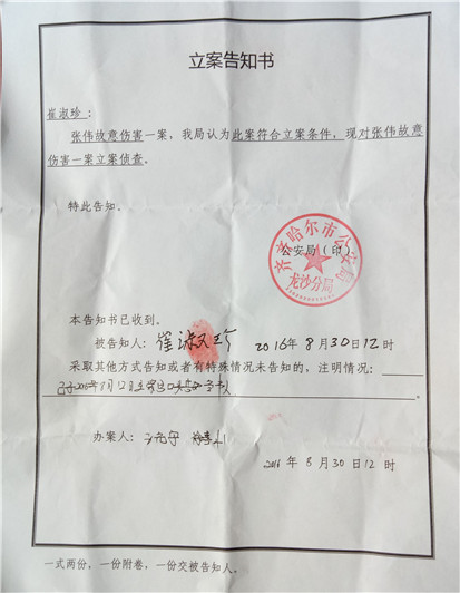 崔淑珍8月30日签收的警方对张伟故意伤害一案立案侦查的立案告知书