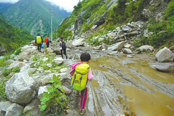 由于下雨,石头有些湿滑,潘土丰抱着雯雯,缓缓前行,每一步,得先用脚试着踩一下,确定踩实了,再下脚。除了石头路,还有泥巴路。“这段路,我们走了一个多星期才走完。”虽然沿途惊险重重,好在,一家人平安到达终点。