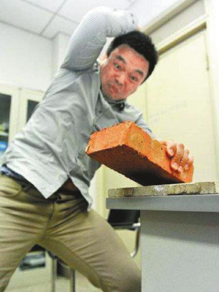 图为四川大学计算机科学系的年轻教师魏骁勇“徒手劈砖”。