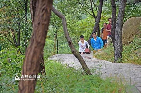 10日上午9点,高志宇一家和陈州如约来到崂山风景区,随行的还有几位青岛当地的志愿者。本来打算乘坐缆车前往半山腰,再开始“征服崂山”之旅,但由于雷雨天气缆车暂停运营,一行人只好从巨峰索道入口处开始爬山。