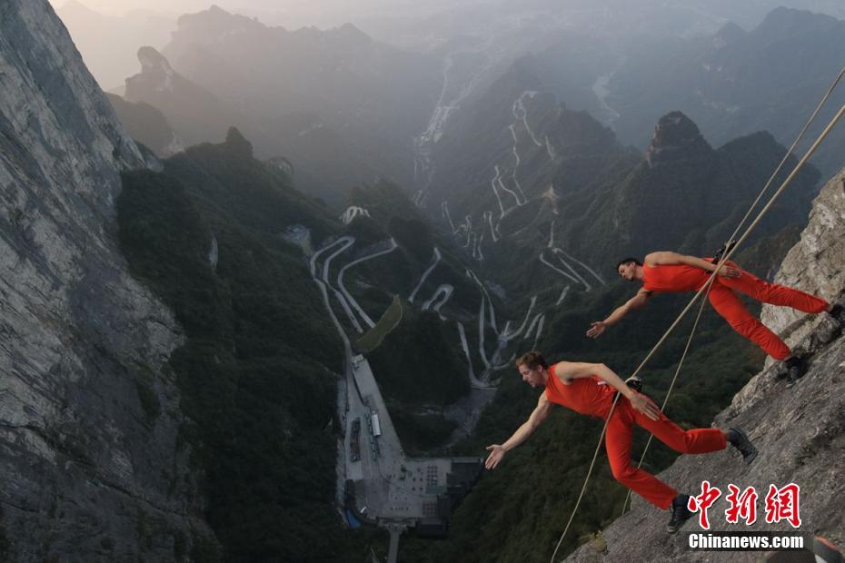 连日来,美国BANDALOOP高空舞团在湖南张家界天门山景区上演了一场场优雅而惊险的悬崖舞蹈秀,过往游客被深深吸引,惊叹不已。此次表演以“翩跹云界、极限飞天”为艺术主题,舞者通过优雅而又惊险的舞姿,与鬼斧神工般自然奇景进行互动,阐述舞蹈与自然的关系,使舞蹈艺术盛放云端。9月13日,该舞团将在天门山的天门洞景点带来正式演出。James adamson 摄