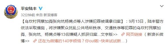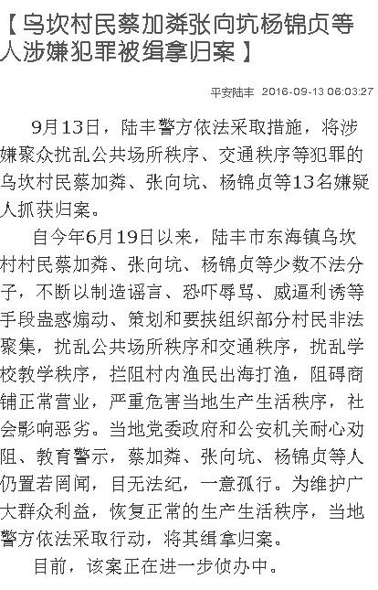 9月13日,陆丰警方依法采取措施,将涉嫌聚众扰乱公共场所秩序、交通秩序等犯罪的乌坎村民蔡加粦、张向坑、杨锦贞等13名嫌疑人抓获归案。